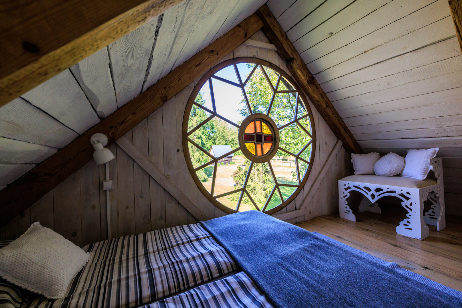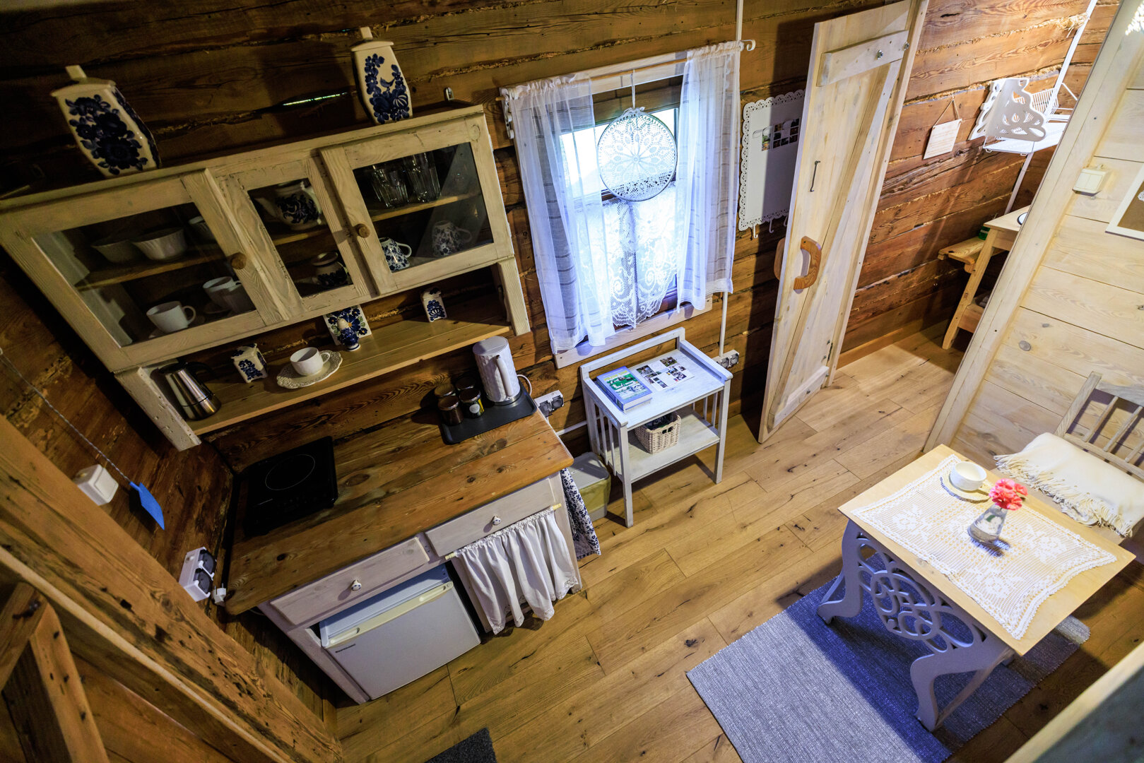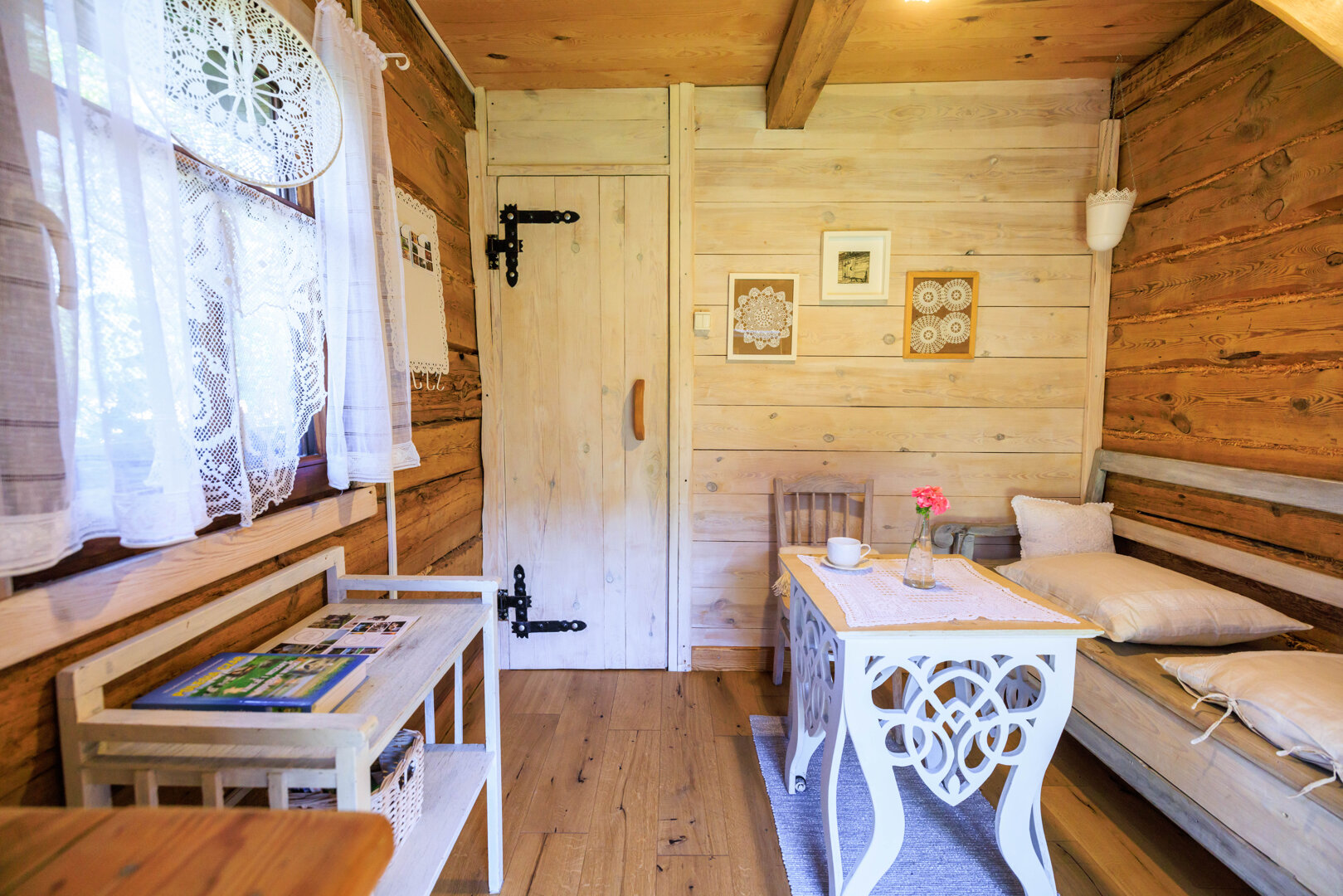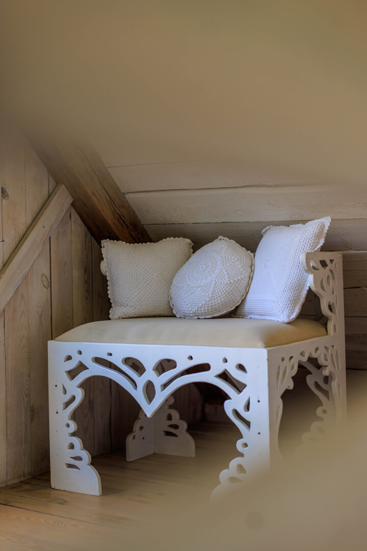 Spitzen-Studio für 2 Personen mit wunderschönem rundem Fenster und ungewöhnlicher Geschichte. Es hat zwei Geschosse. Unten gibt es eine Erholungsecke mit einer alten Dorfbank, sog. Schranke, Bad mit Dusche und Küchenecke. Auf dem Hängeboden gibt es ein Bett mit breiter Matratze (180 cm), aus dem es einen schönen Blick auf eine Wiese und den Horizont, hinter dem die Sonne aufgeht, gibt. Wie der Name sagt, gibt es hier viele Spitzen, die dem Raum ungewöhnliche Atmosphäre verleihen. In der Küche gibt es alles, was zur Vorbereitung einer Mahlzeit notwendig ist, Wasserkessel, Kühlschrank, Herd. Bad mit Dusche mit Handtüchern und Haartrockner. Vermietet wird es im Frühling und Sommer.