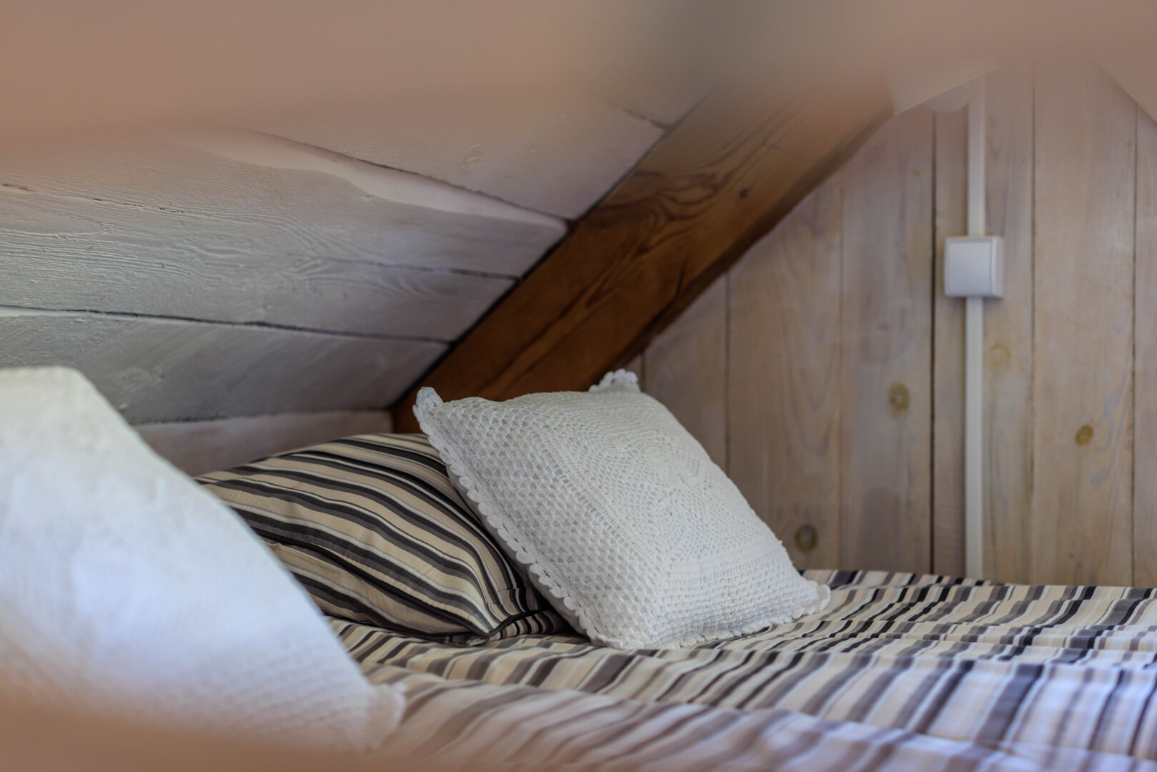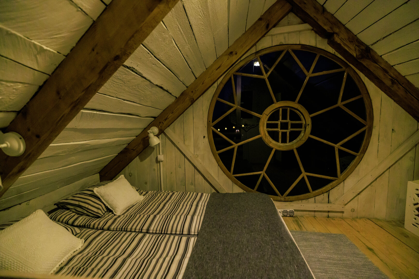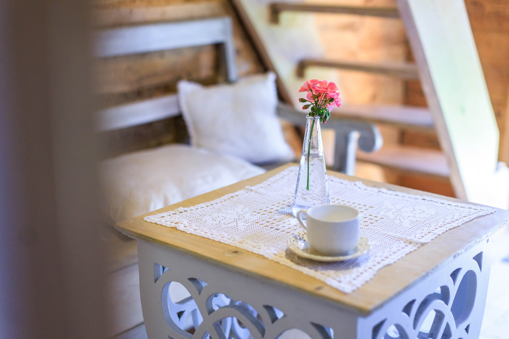 Spitzen-Studio für 2 Personen mit wunderschönem rundem Fenster und ungewöhnlicher Geschichte. Es hat zwei Geschosse. Unten gibt es eine Erholungsecke mit einer alten Dorfbank, sog. Schranke, Bad mit Dusche und Küchenecke. Auf dem Hängeboden gibt es ein Bett mit breiter Matratze (180 cm), aus dem es einen schönen Blick auf eine Wiese und den Horizont, hinter dem die Sonne aufgeht, gibt. Wie der Name sagt, gibt es hier viele Spitzen, die dem Raum ungewöhnliche Atmosphäre verleihen. In der Küche gibt es alles, was zur Vorbereitung einer Mahlzeit notwendig ist, Wasserkessel, Kühlschrank, Herd. Bad mit Dusche mit Handtüchern und Haartrockner. Vermietet wird es im Frühling und Sommer.