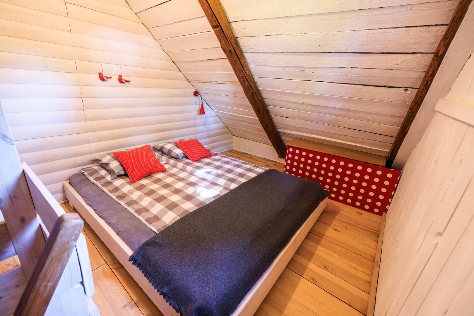 Punkte-Studio für 2 Personen ist ein bunter und fröhlicher Raum, wo Punkte vorherrschen. Es hat zwei Geschosse. Unten gibt es eine Erholungsecke mit einer alten Dorfbank, sog. Schranke, Bad mit Dusche und Küchenecke. Auf dem Hängeboden (Eingang über eine steile Treppe) gibt es ein Bett mit breiter Matratze (180 cm). In der Küche gibt es alles, was zur Vorbereitung einer Mahlzeit notwendig ist, Wasserkessel, Kühlschrank, Herd. Bad mit Dusche mit Handtüchern und Haartrockner. Vermietet wird es im Frühling und Sommer.
